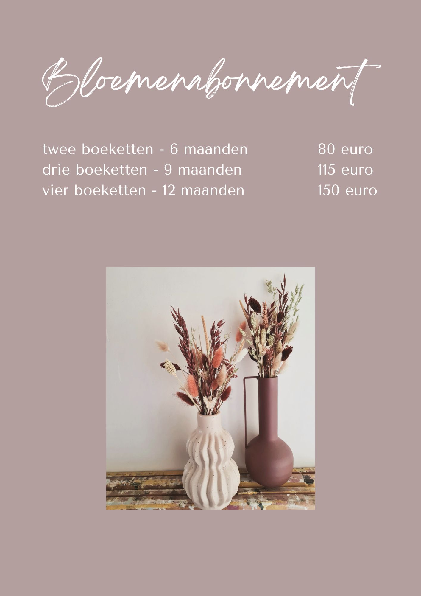 Hou je van afwisseling in je interieur, op je bureau of op de receptie van je bedrijf? Daar heb ik een oplossing voor! Kies voor een bloemenabonnement bij Bloei & geniet elke 3 maanden van een nieuw boeketje met vaas. Ik kom graag de andere vaas persoonlijk inwisselen aan de deur voor een nieuw exemplaar.